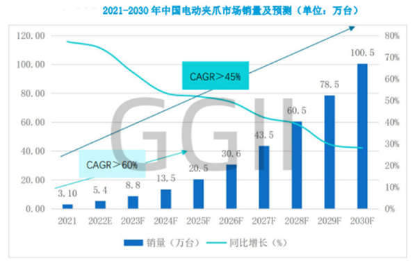 對于電動夾爪銷量,GGII 認為,未來5年中國電動夾爪整體銷量年均復合增速將超過 60%,未來十年中國電動夾爪整體銷量年均復合增速將超過45%。預計到2025年,國內電動夾爪銷量將突破20萬臺,到2030年,國內電動夾爪銷量將突破100萬臺。